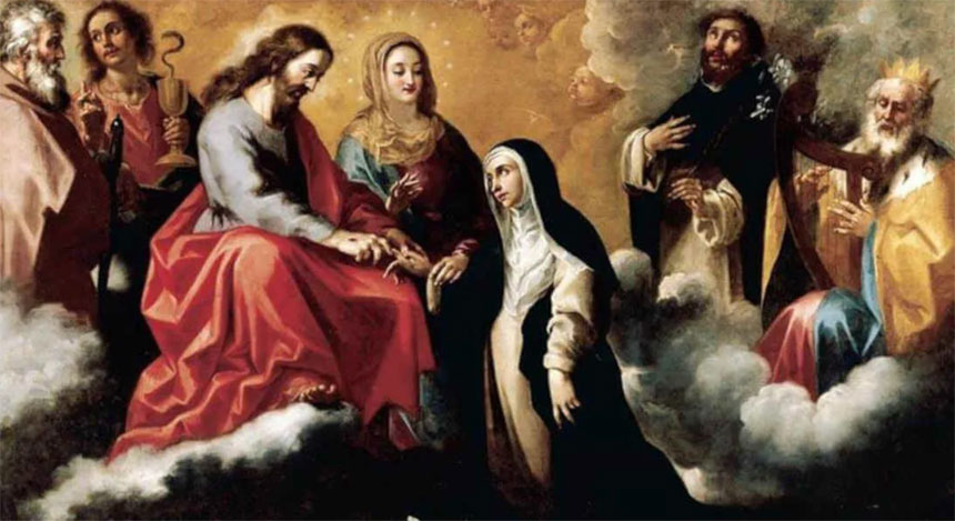 One day, while she was praying in her room, Christ and our Blessed Lady appeared to her. Taking Catherine’s hand, our Lady held it up to her Son, who placed on it a ring that was visible to Catherine but never to other people.