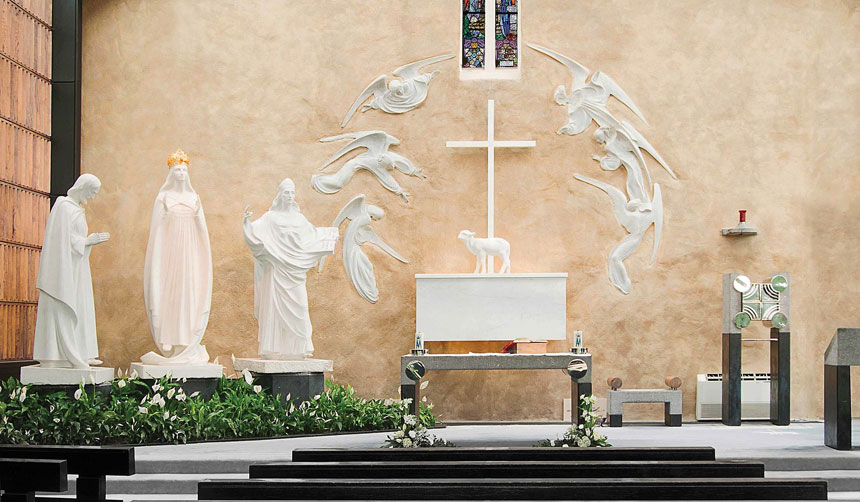 Our Lady appeared with St. Joseph and St. John the Evangelist, a Lamb and cross on an altar at the gable wall of the parish church in Knock in County Mayo, Ireland.